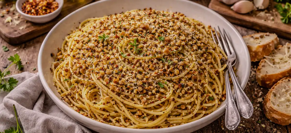 This kind of pasta comes from southern Italian cooking, where pantry ingredients are used thoughtfully to build depth without relying on heavy sauces. Breadcrumbs-sometimes called "poor man's parmesan"-bring texture and a bit of richness, while anchovies melt into the oil and quietly build a savory backbone.